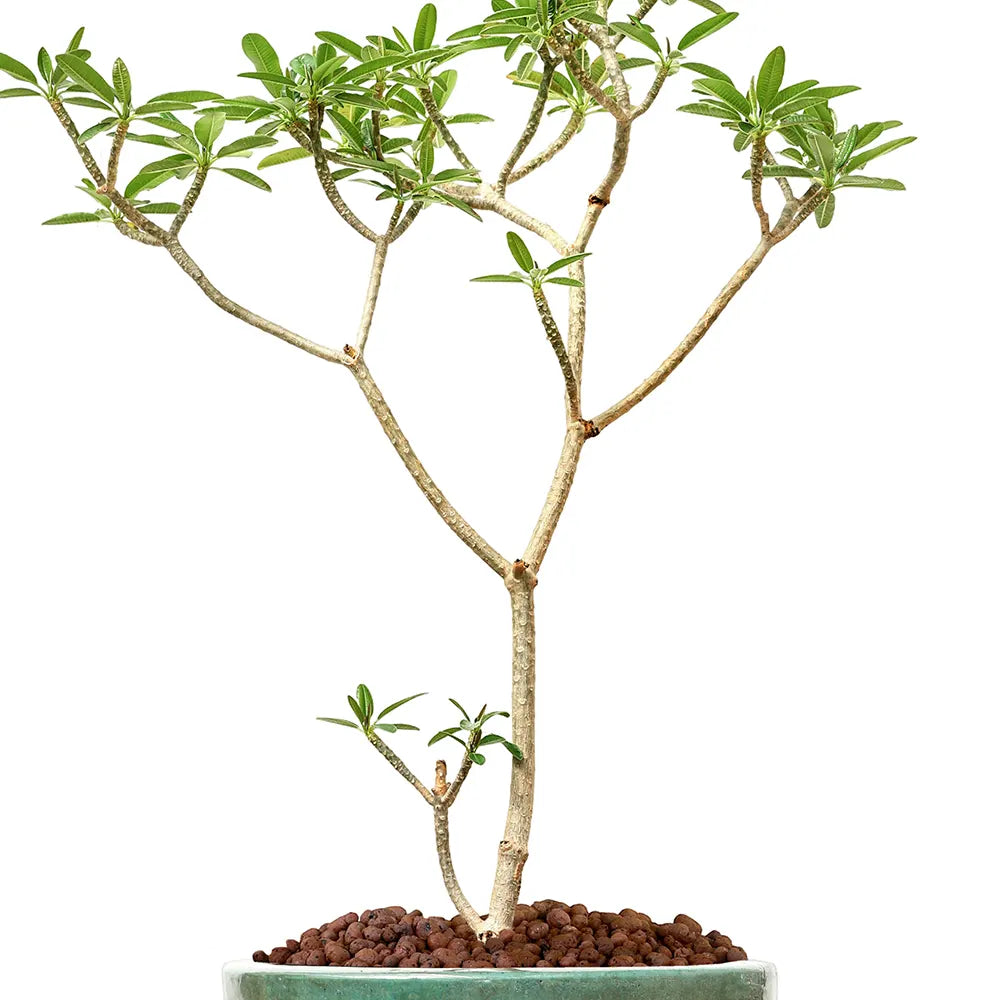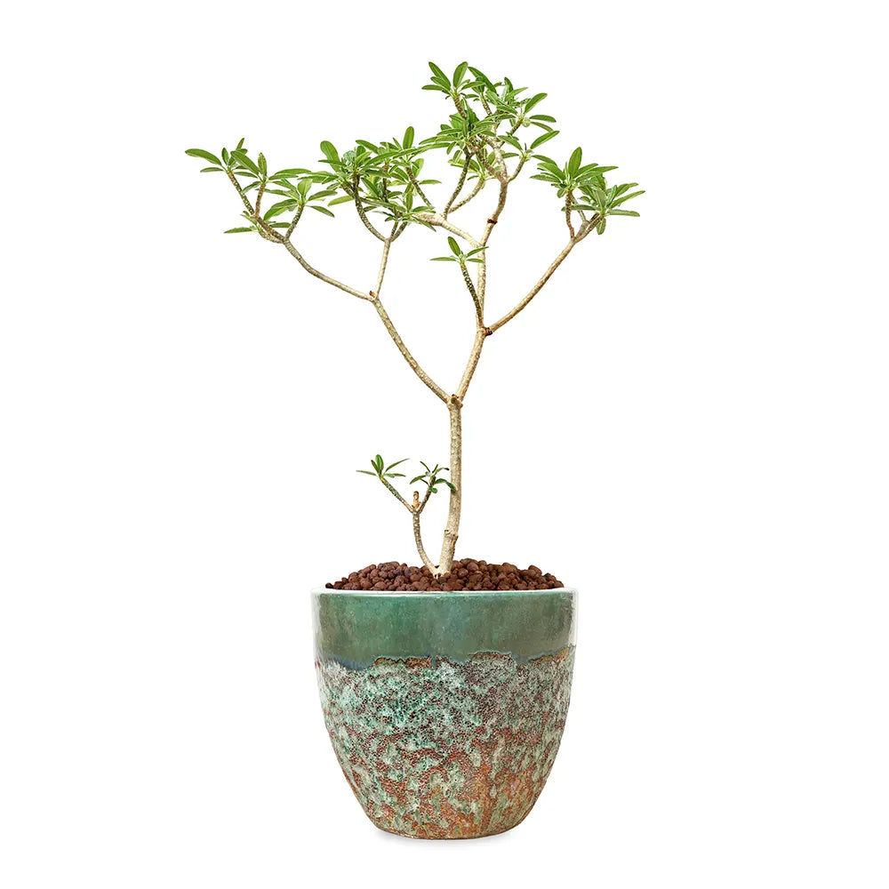 أضف لمسة استوائية أنيقة إلى مساحتك الخارجية مع نبات البلوماريا ، وهو نبات مزهر خلاب يشتهر بأزهاره العطرة والفريدة وأوراقه الخضراء الوارفة. يُقدم هذا النبات الجميل في حوض سيراميكي أنيق بلون أزرق مائي ، وينمو بشكل مثالي في الحدائق المشمسة والباحات والمساحات الخضراء، ليضفي سحرًا طبيعيًا وألوانًا زاهية على أي مكان خارجي.