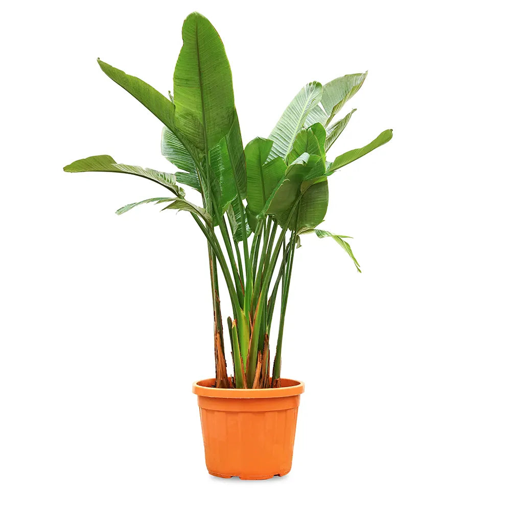 تضفي Strelitzia Nicolai لمسة استوائية مذهلة على حديقتك. أوراق ضخمة غريبة الشكل تشبه المجداف، خضراء/رمادية اللون ومرتبة على شكل مروحة في أعلى السيقان، تعطي تأثيرًا فوريًا وإحساسًا بالغابة.