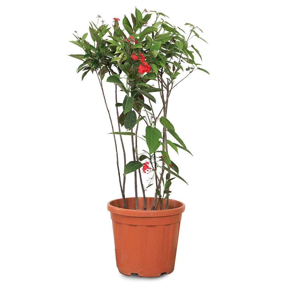 الجاتروفا إنتيجيريما شجيرة دائمة الخضرة، أوراقها لامعة ومتغيرة الشكل، وأزهارها حمراء زاهية تشبه عناقيد النجوم. سهلة العناية بها وتتحمل الجفاف.