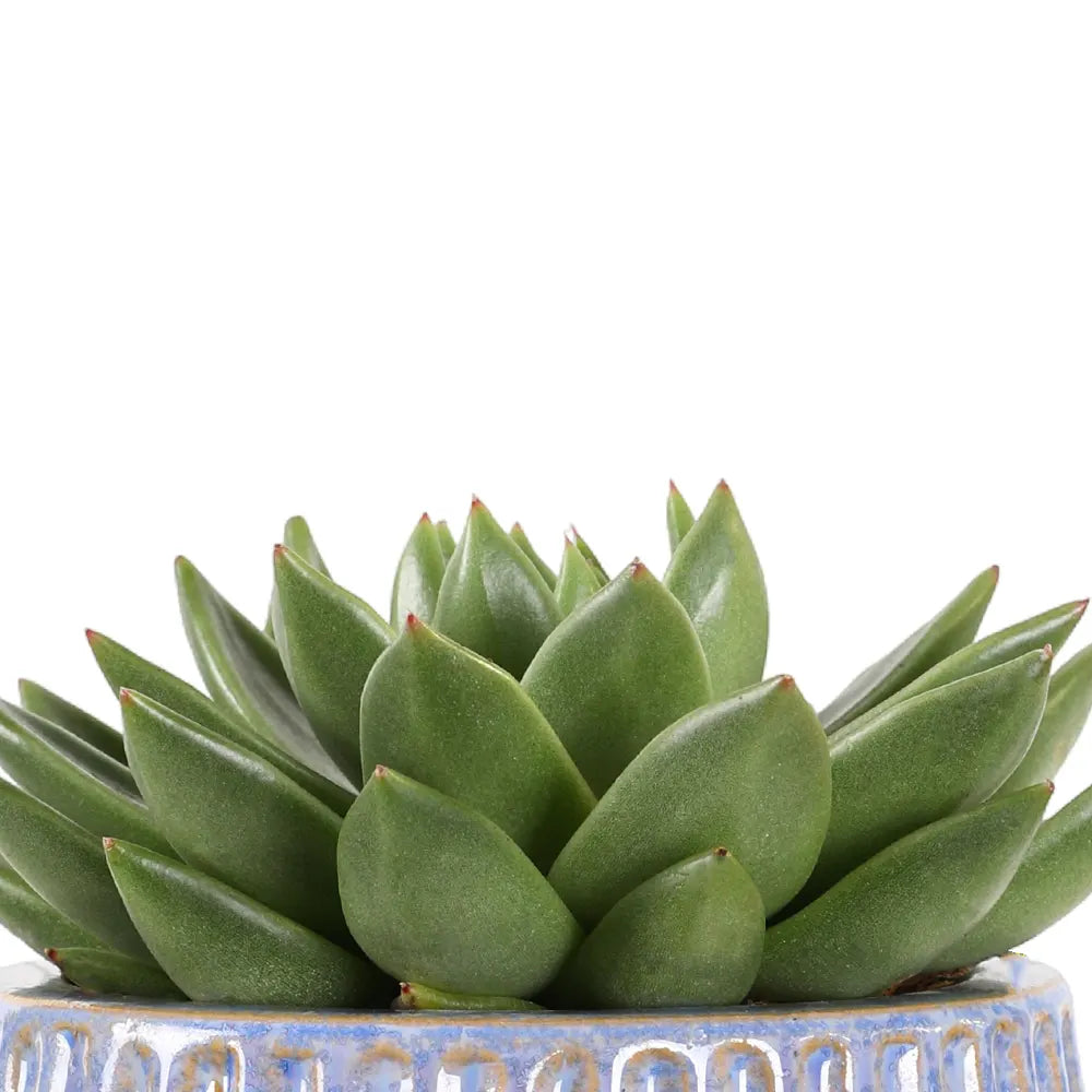 A thoughtfully curated gift for the discerning plant lover, this echeveria succulent arrives in an elegant blue ceramic vessel that elevates any interior. Hand-selected for its vibrant rosette structure, this botanical specimen requires minimal care—thriving on bright light and infrequent watering. Perfect for those seeking sustainable, living décor, the echeveria's architectural form and soft, fleshy foliage create a sophisticated focal point. The boutique-quality ceramic pot ensures this gift feels premium and intentional, making it an ideal present for housewarming celebrations, wellness enthusiasts, or anyone who appreciates cultivated beauty with effortless elegance.