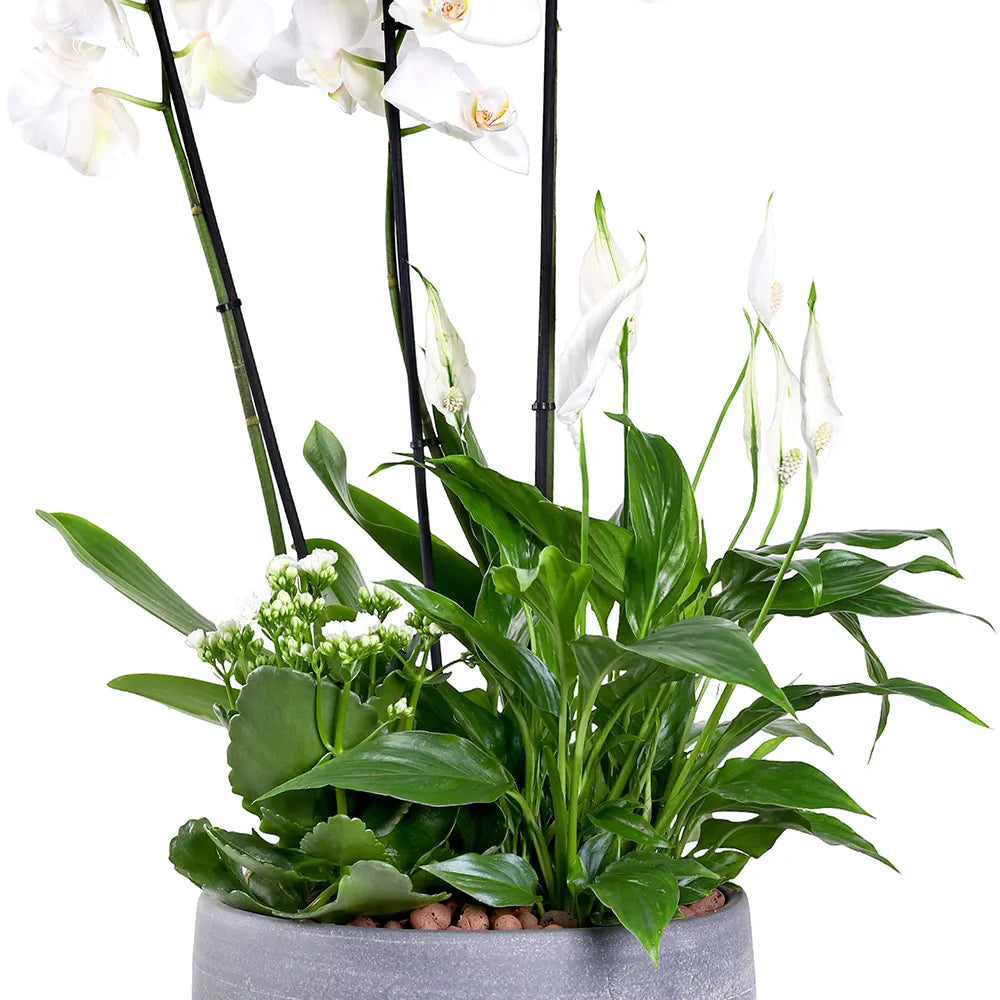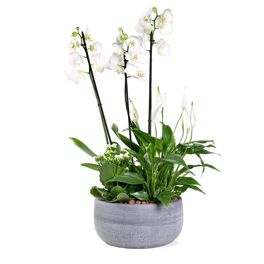 Elevate your space with this expertly crafted flower arrangement in a sleek grey bowl. Combining natural beauty with modern design, it brings a refined touch to any room. Perfectly balanced in color and form, this arrangement enhances your décor while requiring minimal upkeep, offering lasting elegance and freshness.