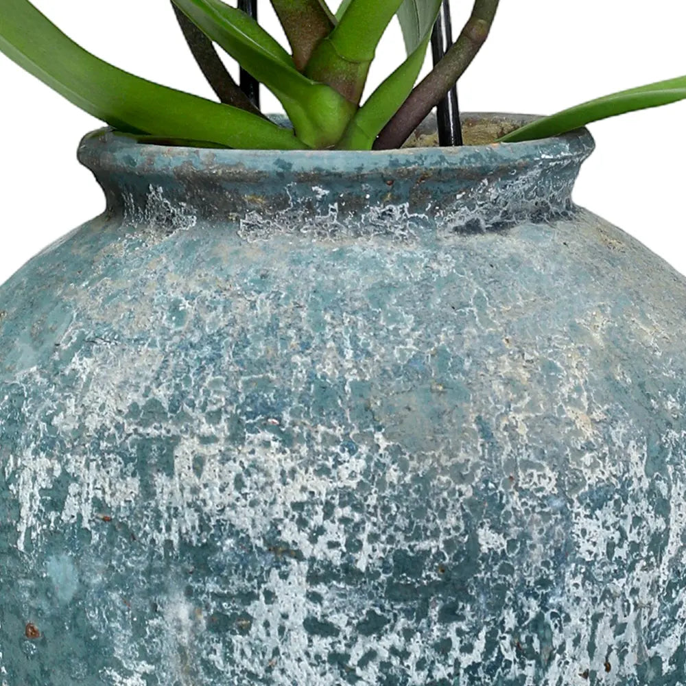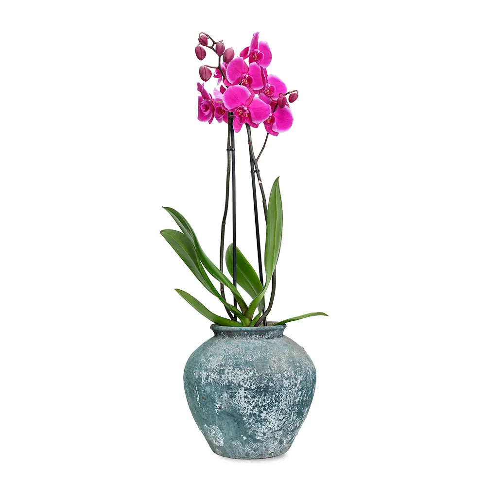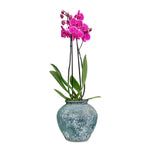 PINK ORCHID IN ANTIQUE BLUE POT